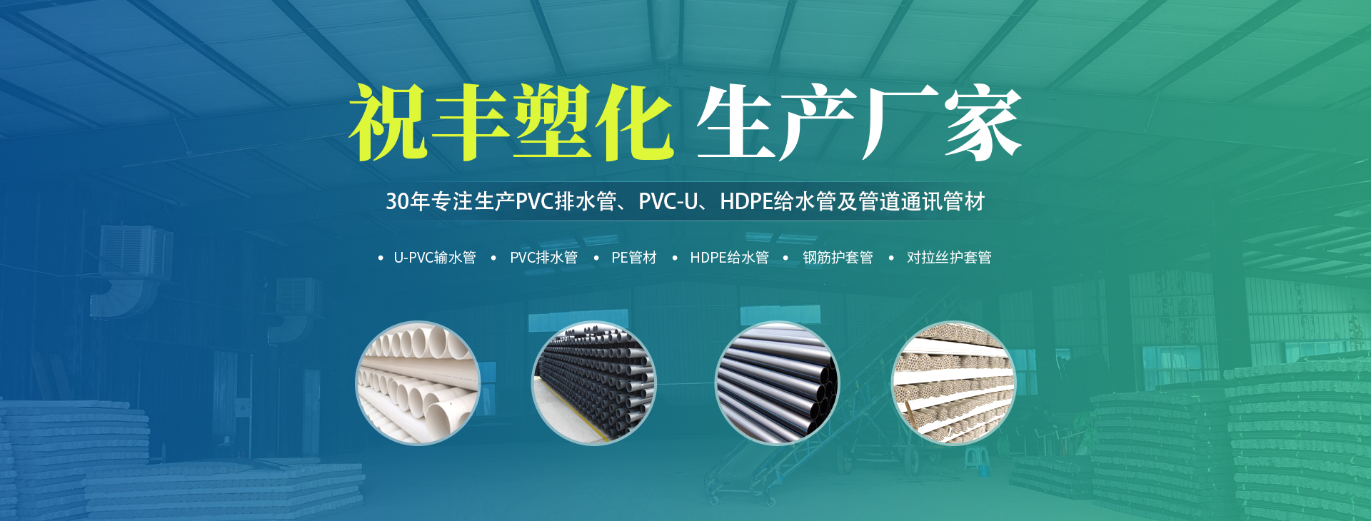 安陽(yáng)市祝豐塑化有限公司坐落在滑縣工業(yè)園區(qū),東臨大廣高速,西臨京珠高速,是鄭州、鶴壁、安陽(yáng)、濮陽(yáng)四個(gè)城市的輸紐,交通便利、環(huán)境優(yōu)美。 公司始建于八十年代,經(jīng)過二十余年的艱辛創(chuàng)業(yè),規(guī)模不斷壯大,由十多萬元資產(chǎn)的小廠,發(fā)展到現(xiàn)占地面積達(dá)一萬多平,建筑面積一萬平,資產(chǎn)2000多萬元管材生產(chǎn)企業(yè)。公司生產(chǎn)PVC-U、PVC排水管、HDPE給水管、鋼筋護(hù)套管管道通訊管材等產(chǎn)品,廣泛用于農(nóng)田節(jié)水、高山引水、人畜用水、建筑、電力通訊等多種用途,品種齊全。為了滿足用戶需求,可承攬各種給水、節(jié)水、灌溉工程。“祝豐塑化”憑借強(qiáng)勁的實(shí)力,優(yōu)良的管理水平。“以質(zhì)量求生存,以信譽(yù)求發(fā)展”的原則全力以赴和大家共同塑造美好未來。..